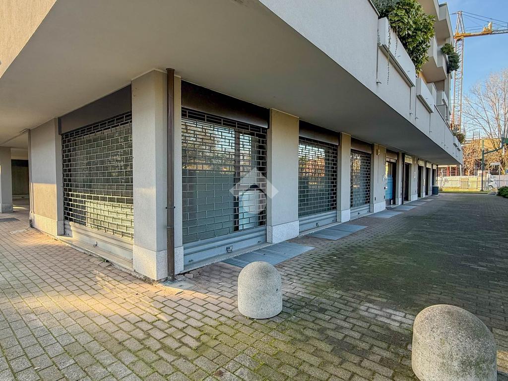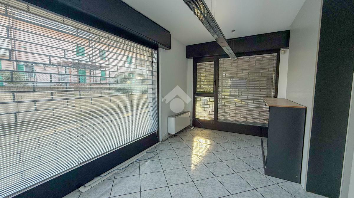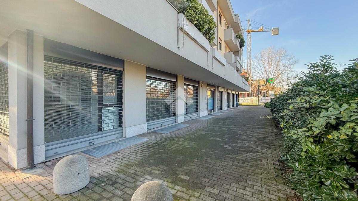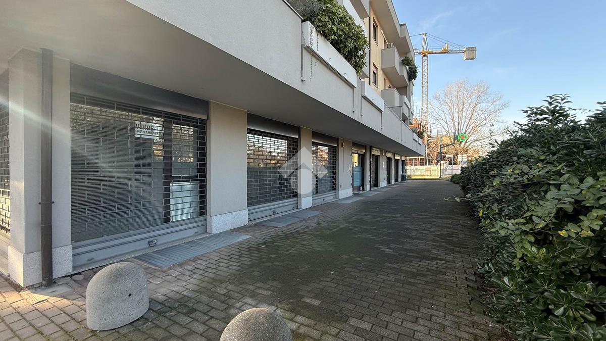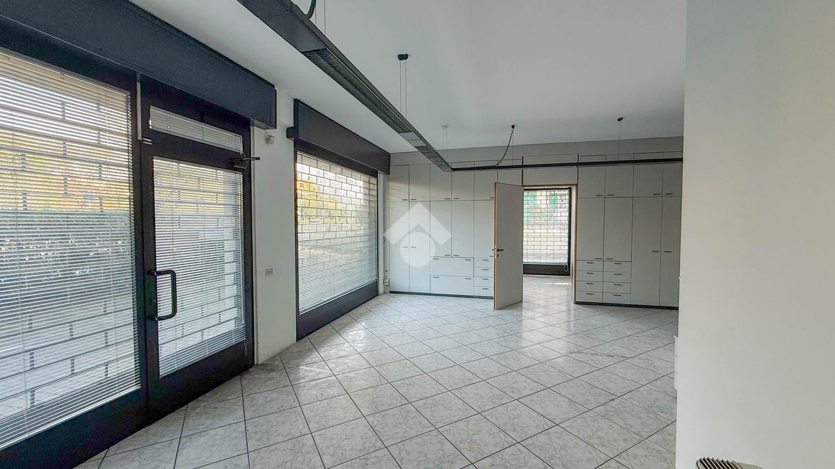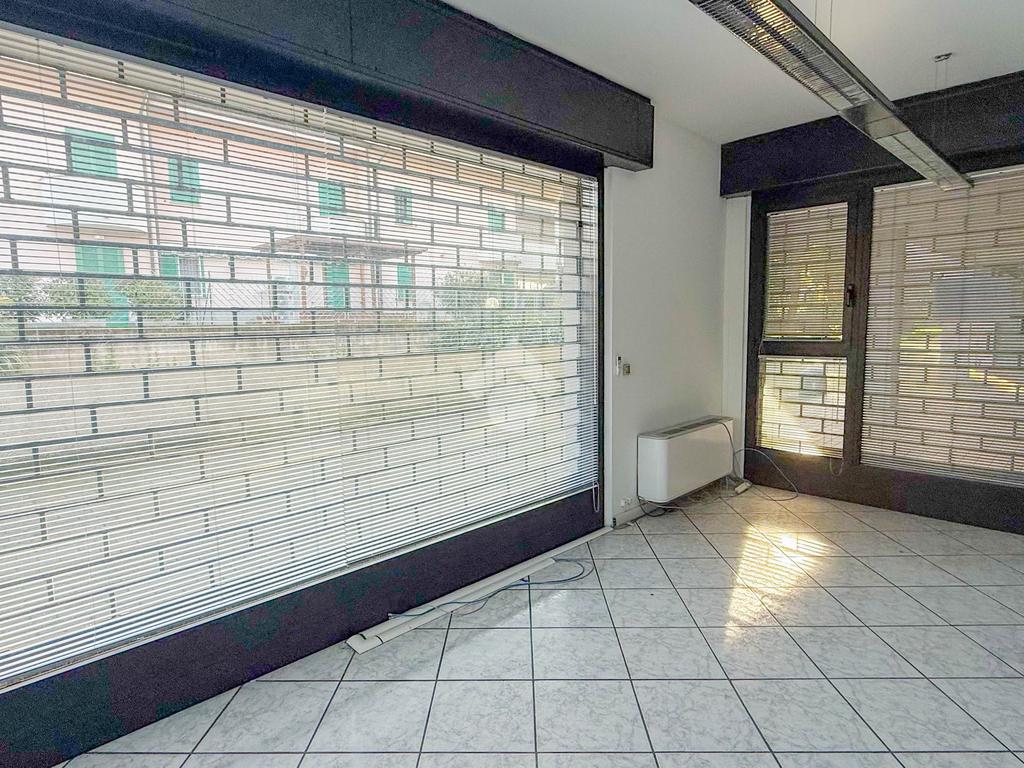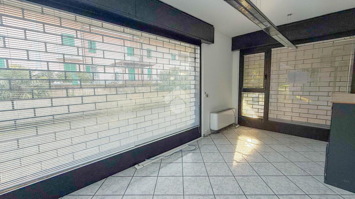 Proponiamo in locazione un negozio di circa 120 metri quadrati, situato al piano terra di un edificio a quattro livelli.
